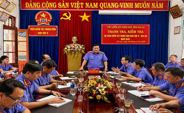 Thực hiện Quyết định số 867/QĐ-VKS và Kế hoạch số 868/KH-VKS-TTr ngày 31/3/2026 của Viện trưởng Viện KSND tỉnh Gia Lai về việc tiến hành thanh tra, kiểm tra theo kế hoạch tại Viện KSND khu vực 8 – Gia Lai. Trong 02 ngày 08-09/4/2026, Đoàn thanh tra, kiểm tra của Viện KSND tỉnh đã tiến hành thanh tra, kiểm tra công tác quản lý, chỉ đạo, điều hành của người đứng đầu đơn vị; công tác tổ chức cán bộ, thi đua – khen thưởng; công tác quản lý, sử dụng tài chính, tài sản công và kiểm tra việc chấp hành các quy định của Đảng, Nhà nước và của Ngành về công tác phòng, chống tham nhũng, lãng phí, tiêu cực; kiểm tra việc thực hiện dân chủ cơ sở tại Viện KSND khu vực 8.